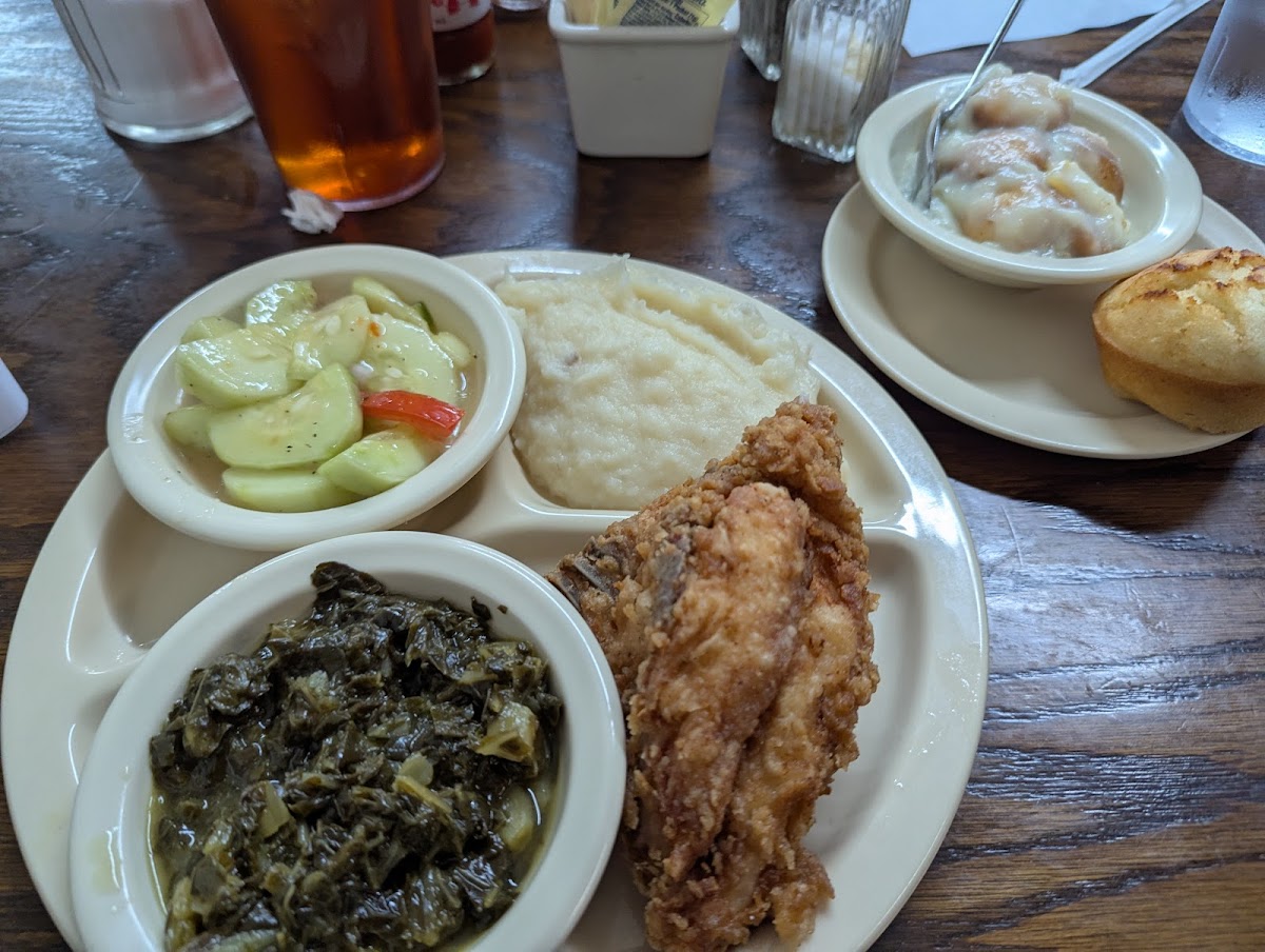 Down home great food, historic atmosphere, very friendly people! I had beef tips and rice, fried okra, slaw and cornbread with homemade chocolate pudding for dessert. I plan to go back as soon as I get a chance!